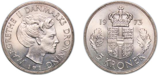 Denmark 1973 S♥B 5 Kroner - Margrethe II Copper-nickel (75% Copper, 25% Nickel) Royal Danish Mint (3774000) 15.12g UNC KM 863 Schön 81