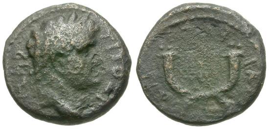 Title: Titus, as Caesar (AD 69-79) Decapolis. Gadara Æ17 / Crossed Cornucopiae