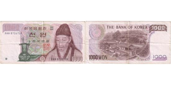 | | South Korea, 1000 Won, EF(40-45) | | | Yi Hwang at right. One raised colored dot for visually impaired at lower left., Buildings of Tosansowon Academy., Purple on multicolor underprint. | | FEATURES |