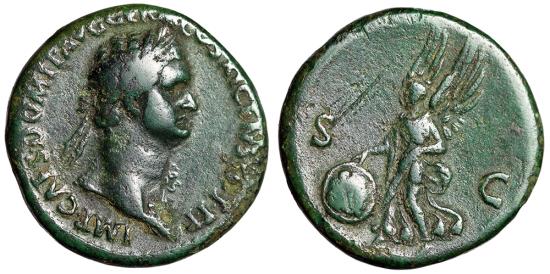 Domitian AE As Rome Mint 85 AD Obverse: IMP CAES DOMIT AVG GERM COS XI CENS POT P P Bust of Domitian, laureate, right with aegis Reverse: Victory advancing left, holding shield inscribed S P Q R; S-C in fields References: RIC 388 Size: 26mm, 10.12g Professional Numismatic Notes: Very-fine with a beautiful natural pine-green patina! A scratch in the field of the reverse which did not break through the entire patina.