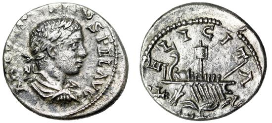 ELAGABALUS AR DENARIUS Antioch Mint 218-222 AD Obverse: ANTONINVS PIVS FEL AVG Bust of Elagabalus, laureate, draped, cuirassed, right Reverse: FELICITAS TEMP Ship with sail and seven rowers and pilot; on stern, standard and acrostolium; at prow, furled sail References: RIC 188d Scarce Size: 19mm, 3.16g Professional Numismatic Notes: About extremely-fine; some spotty toning but otherwise very attractive! A scarce and interesting type!