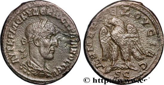 TRAJAN DECIUS Tétradrachme syro-phénicien 251 Antioche, Syrie, Séleucie et Piérie billon Obverse : Buste lauré, drapé et cuirassé de Trajan Dèce à droite, vu de trois quarts en arrière (A*2), trois globules sous le buste Reverse : S C à l’exergue Aigle debout à gauche sur une palme, les ailes déployées, tête à gauche et queue à droite, tenant une couronne feuillée dans son bec Commentary : Monnaie centrée. Usure régulière. Joli revers. Patine grise