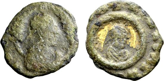 Kingdom of Axum, Ouazebas Gilt Æ Unit. Circa AD 375-410. 0.87g, 14mm, 12h. [⧾ OYΛZHCΛC CΛCIXCYC] ("King Ouazebas"), draped bust to right, wearing headcloth, flanked by wheat stalks / [⧾ TOYTOΛPCCHTHXѠPΛ] ("may this please the country"), small draped bust to right, wearing headcloth; all within circular border. Hahn & Keck 37; SACAM 192-220; H 26; AC 54-8. VF+