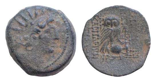 SELEUKID KINGS of SYRIA. Cleopatra Thea and Antiochos VIII, 125-121 BC. Ae 18mm 5,4g Antioch on the Orontes. Radiate head of Antiochos VIII. Owl , Amphora