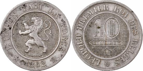 | Belgium, Leopold I, 10 Centimes, 1862, Brussels, Copper-nickel, |