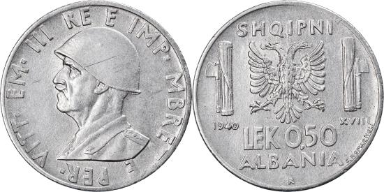 | | Coin, Albania, Vittorio Emanuele III, 0.50 Lek, 1940, Rome, , Stainless | | | Helmeted head left, Double eagle between columns, value below | | FEATURES |