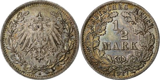 | | GERMANY - EMPIRE, 1/2 Mark, 1917, Berlin, , Silver, KM:17 | | | Denomination within wreath, Crowned imperial eagle with shield on breast within wreath, Some coins dated from 1918-19 were issued with a black finish to prevent hoarding. | | FEATURES |