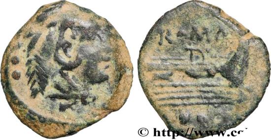 ROMA à lexergue Proue de galère (rostre) à droite ; devant trois globules