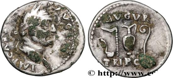 AVGVR (au-dessus)// TRI POT (à lexergue) Instruments pontificaux : simpulum, aspersoir, capis (vase à sacrifice) et lituus