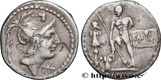 POBLICIA Denier 96 AC. Rome R2 silver Obverse : Anépigraphe Tête imberbe casquée de Mars à droite, coiffé du casque attique à cimier et à plumet, surmonté d’un marteau ; sous le menton, marque de valeur (XVI) en monogramme Reverse : C M/(AL)/ P couché Combattant ou Hercule nu debout à gauche, la main gauche dans le dos, tenant un long sceptre ou une javeline transversale de la main droite, le pied droit posé sur une cuirasse, placée devant un trophée ; derrière, une proue de navire (rostre) à gauche surmonté d’un symbole, un caducée Commentary : Beau denier bien centré, à l’usure fine et régulière. Patine grise