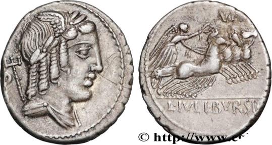 JULIA Denier 85 AC. Rome silver Obverse : Anépigraphe Buste drapé d’une divinité ternaire à droite (Véjovis ?) : Genius (Génie), lauré pour Apollon, ailé pour Mercure avec un trident sur l’épaule pour Neptune ; derrière le buste, un symbole Reverse : L. IVLI. BVRSIO à l’exergue Victoire dans un quadrige galopant à droite, brandissant une couronne de la main droite et tenant les rênes de la main gauche Commentary : Monnaie légèrement décentrée au droit. Très beau buste de Véjovis, bien venu à la frappe. Revers agréable présentant une fine usure régulière. Patine grise avec de légers reflets dorés