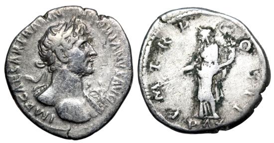 Hadrian A.D. 118 AR Denarius 19mm 2.9g IMP CAESAR TRAIAN HADRIANVS AVG; laureate and heroically nude bust right with aegis on left shoulder. P M TR P COS III; Pax, standing l., holding branch and cornucopiae; in ex. PAX. RIC II Rome 124