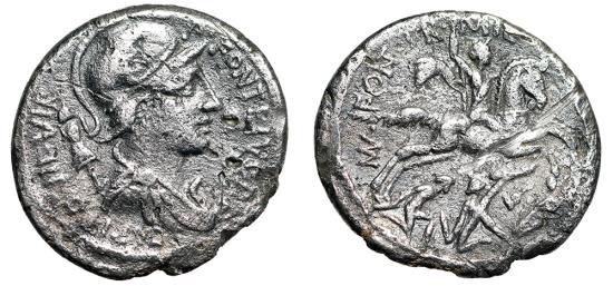 P Fonteius PF Capito AR Denarius "Warrior on Horse, Enemies" Good Fine