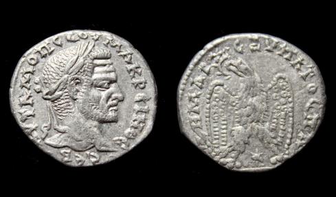 Ave! Syria, Seleucia and Pieria, Macrinus, Tetradrachm, Eagle reverse, Outstanding! AR; 27mm/12.3gm Seleucia and Pieria, Laodicea ad Mare; Struck ca. 217-218 AD Con/ Extremely Fine; a well-centered and sharply struck example of this scarce issue with mint luster. The portrait is particularly realistic (note the furrowed brow) and the CEB below is scarce. Obv/ AYT K M OΠ CE MAKPEINOC CEB; Laureate head of Macrinus to right Rev/ ΔHMAPX EΞ YΠATOC Π Π; Eagle standing facing, his head turned to left, with wreath in his beak and his wings spread; between his legs, star. Ref/ Prieur 1180 |
