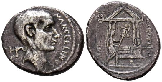 GENS CLAUDIA. Denarius. (Ar. 3.54g/20mm). 50 Fine Rome. (Crawford 439/1; FFC 571). Obv: Head of the consul M. Claudius Marcelus right, behind triquetra, front legend: MAGoodELLINVS. Rev: M. Claudius Marcelus placing trophy inside tetrastyle temple, around legend MAGoodELLINVS COS QVINQ. VF-. Countermarks on reverse. Scarce example.