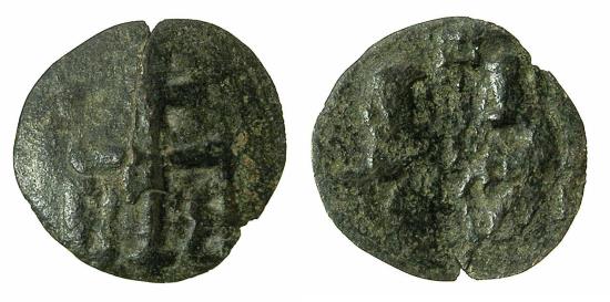 BYZANTINE EMPIRE.Andronicus II joint reign with Michael IX AD 1295-1320.AE.Assaria.Mint of CONSTANTINOPLE. ( 1.35g, 18.2mm, 6h ) Patriarchal cross, letter B either side. Reverse.Andronicus and Michael holding between them labarum. Ref:DOC V Class XXIV, Sear 2451. Very fine / good fine. Scarce. |