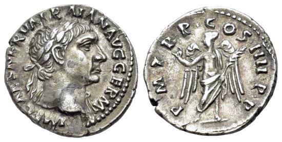 | Trajan (AD 98-117). AR Denarius. Rome, AD 101-102. R/ VICTORY |
