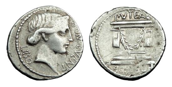 Reverse: Puteal Scrbonianum, decorated with garland and two lyres, hammer at base.