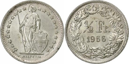 | | Switzerland, 1/2 Franc, 1966, Bern, Silver, , KM:23 | | | Standing Helvetia with lance and shield within star border, Value, date within wreath | | FEATURES |