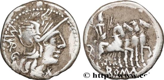 ROMA à lexergue Jupiter, nu debout dans un quadrige au pas à droite, tenant une branche de la main droite, les rênes et un foudre de la main gauche