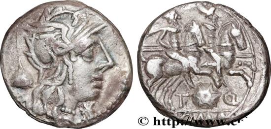 QUINCTIA Denier 126 AC. Rome R1 silver Obverse : Anépigraphe Tête casquée de Rome à droite, coiffée du casque ailé ; derrière la tête, apex (coiffe religieuse de flamine) ; sous le menton, marque de valeur (XVI) en monogramme Reverse : ROMA à l’exergue ; T-Q au-dessus Les Dioscures, Castor et Pollux (les Gémeaux) à cheval, galopant à droite ; ils sont cuirassés avec le manteau flottant sur lépaule, coiffés dun bonnet surmonté dune étoile, tenant chacun une javeline ; dans le champ au milieu, un bouclier macédonien Commentary : Flan court, centré des deux côtés. Joli revers. Patine grise