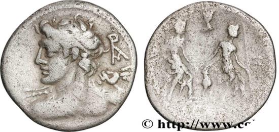 CAESIA Denier 112-111 AC. Rome R1 silver Obverse : Monogramme (ROMA) Buste héroïque et lauré d’Apollon Véjovis à gauche, vu de trois quarts en avant, brandissant un foudre de la main droite avec le manteau sur l’épaule ; derrière la tête un monogramme Reverse : L. CÆSI à l’exergue/ (LA)- (RE) en monogramme de chaque côté Les deux dieux Lares assis de face sur des rochers, tournés à droite, nus jusqu’à la ceinture, tenant chacun un sceptre long de la main gauche ; au milieu, un chien debout à droite ; au-dessus, tête de Vulcain tournée à gauche avec des tenailles derrière la tête Commentary : Flan large, centré. Joli buste. Usure plus importante au revers. Patine grise