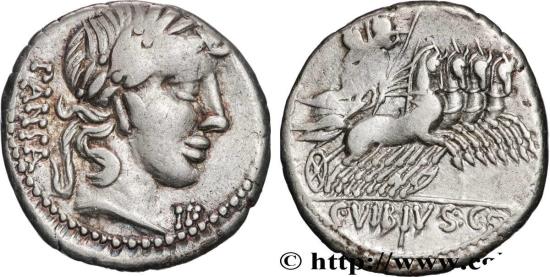 C. VIBIVS. C. F. à lexergue Minerve debout dans un quadrige galopant à droite, casquée, tenant de la main droite un trophée et une longue javeline et les rênes de la main gauche