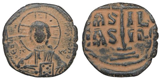 Anonymous, attributed to Romanus III (1028-1034) AE follis (Bronze 26mm 8,03g) Constantinople mint, ca. 1028-1034. Obv: + ЄMMANOVHΛ, nimbate bust of Christ facing, square in each limb of cross; wearing pallium and collobium and holding book of Gospels; Rev: IS - XS / bAS - ILЄ / bAS - ILЄ , legend in three lines divided by limbs of cross with dot at each extremity on three-stepped base. Ref: Sear 1823. Vf+