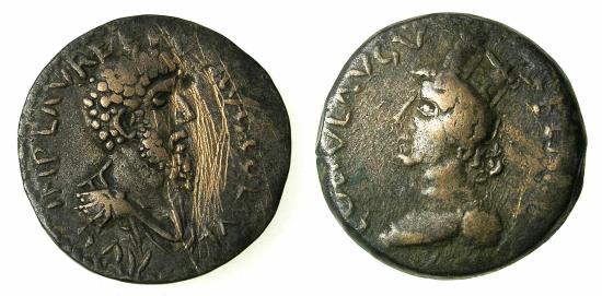 CILICIA.NINICA CLAUDIOPOLIS.Lucius Verus AD 161-169.AE.( 8.94g, 24.3mm, 6h ) IMP L AVR VERVS AVG COL IVL AVG, bare headed and bearded bust right of Lucius Verus. Reverse.COL IVL AVG FEL NI(....) V, bust of Tyche left wearing turreted crown. Ref:RPC IV.10285.( two examples recorded ) Good very fine, obverse small dig before brow and multiple hairline scratches before bust. (The scratches as not as bad as the camera has picked up ) This coin expands the reverse legend that is not completed in RPC IV. We can add to the legend FEL and NI for either NI(NI) or NI(NIC) followed by the letter V. |