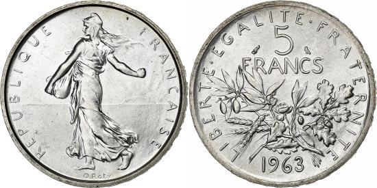 | | Coin, France, Semeuse, 5 Francs, 1963, Paris, , Silver, KM:926 | | | Semeuse, Figure sowing seed, Branches divide denomination and date | | FEATURES |