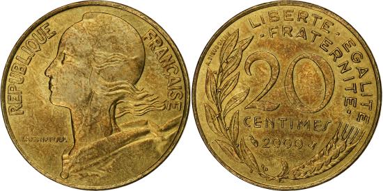 | | France, 20 Centimes, Marianne, 2000, Paris, Aluminum-Bronze, | | | Marianne, Liberty bust left, Denomination above date, grain sprig below, laurel branch at left, Without mint mark. 1991-1993 dated coins, non-Proof, exist in both coin and medal alignment., Henri Lagriffoul | | FEATURES |