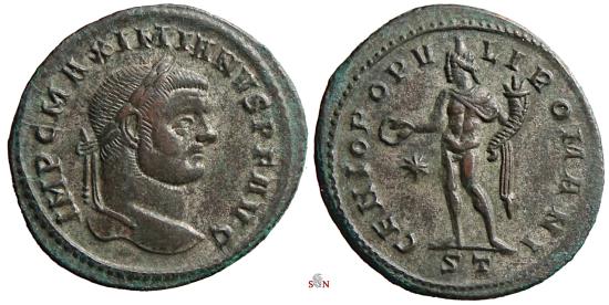 Maximianus Herculius Follis, struck AD 298-299 at Ticinum (Pavia). Obv. IMP C MAXIMIANVS P F AVG, Laureate head right.