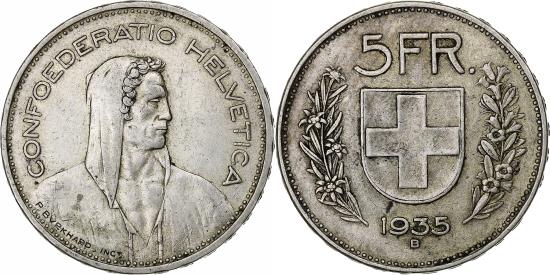 | | Switzerland, 5 Francs, 1935, Bern, Silver, , KM:40 | | | William Tell right, Shield flanked by sprigs, Raised edge lettering. | | FEATURES |
