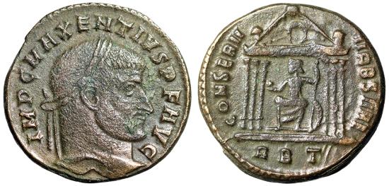 Obverse: IMP C MAXENTIVS P F AVG Head of Maxentius, laureate, right
