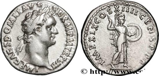 DOMITIANUS Augustus Denier 88-89 Rome silver Obverse : IMP CAES DOMIT AVG GERM P M TR P VIII Tête laurée de Domitien à droite (O*) Reverse : IMP XIX COS - XIIII CENS P P P Minerve marchant à droite, combattant, casquée, vêtue du chiton, avec légide, brandissant une javeline de la main droite et de la gauche, tenant un bouclier Commentary : Monnaie idéalement centrée. Très beau portrait de l’empereur ainsi qu’un revers agréable. Patine grise