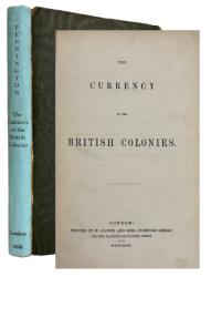 The Currency of the British Colonies, London, 1848, 247 pages, black cloth, lacks spine cloth and titling has been replaced by a computer produced label. Binding sound and contents clean. Attributed to James Pennington whose name does not appear in the work.