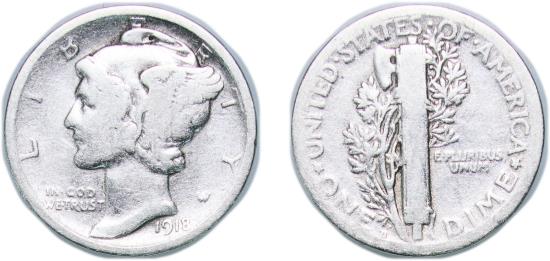 United States Federal republic 1918 D 1 Dime "Mercury Dime" Silver (.900) United States Mint of Denver, (22674800) 2.38g VF KM 140 Schön 133