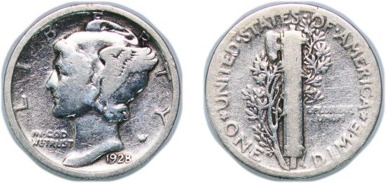 United States Federal republic 1928 1 Dime "Mercury Dime" Silver (.900) United States Mint of Philadelphia (19480000) 2.38g VF KM 140 Schön 133