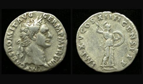 Domitian, Denarius, Minerva Brandishing Spear and Shield reverse