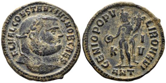 Constantius I Chlorus, as Caesar. 293-305 AD. AE Follis (9.31g, 27mm). Antioch mint. Struck circa 300/1 AD. Obv.: FL VAL CONSTANTIVS NOB CAES, laureate head right. Rev.: GENIO POPVLI ROMANI, Genius standing left, modius on head, naked but for chalmys over left shoulder, pouring liquid from patera and holding cornucopia; K in left field, I / V in right field; ANT in exegue. RIC 55a. Sandy deposits, VF. |