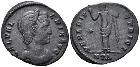 Galeria Valeria, Augusta. 293(?)-311 AD. AE Follis (5.27g, 26mm). Heraclea mint. Struck 309/10 AD. Obv.: GAL VALERIA AVG, draped bust right. Rev.: VENERI VICTRICI, Venus standing left, holding up apple and raising drapery over shoulder, in fields: star and crescent; HTΔ in exergue. RIC 50. VF. |