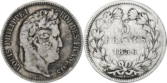 | | Coin, France, Louis-Philippe, 5 Francs, 1836, Lyon, , Silver, KM:749.4 | | | Louis-Philippe, Laureate head right, Mint marks at edge outside wreath | | FEATURES |