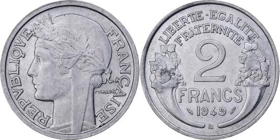 | | France, 2 Francs, Morlon, 1949, Beaumont - Le Roger, Aluminum, | | | Morlon, Laureate head left, Denomination and date flanked by cornucopias | | FEATURES |