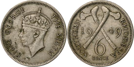 | | Southern Rhodesia, George VI, 6 Pence, 1949, Copper-nickel, , KM:21 | | | Crowned head left, Crossed axes divide date and value, Percy Metcalfe | | FEATURES |