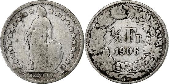 | | Switzerland, 1/2 Franc, 1906, Bern, Silver, , KM:23 | | | Standing Helvetia with lance and shield within star border, Value, date within wreath | | FEATURES |