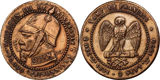 | | France, Satirical coin, Napoléon III, 1870, Bronze, | | | A satirical medal based on Napoleon III's centimes, a particular target for satire. Our medal begins with the emperor smoking, wearing a Prussian spiked helmet and a necklace attached to a chain bearing the inscription Sedan, the battle he lost and which put an end to the Second Empire and his reign. His epithet is the pejorative word "miserable", while the number of prisoners captured at the Battle of Sedan is indicated below. On the reverse, the head of the imperial eagle and the thunderbolt are replaced respectively by an owl and a cannon resting on bones, certainly those of soldiers who died in the battle. The word "Empire" has been replaced by "Vampire", which is phonetically close and refers to a monstrous creature. Finally, the dates of his reign - from his coup d'état to his defeat at Sedan" - are inscribed below, underlining his end. | | FEATURES |