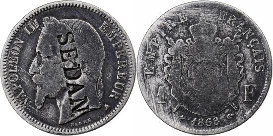 | | France, Napoleon III, Franc, Napoléon III, 1868, Paris, Silver, , SEDAN | | | Napoléon III, Laureate head left, Crowned and mantled arms divide denomination, SEDAN | | FEATURES |