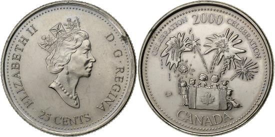 | | Canada, Elizabeth II, 25 Cents, 2000, Royal Canadian Mint, Nickel, | | | Crowned head right, denomination below, Fireworks, children behind flag, date above | | FEATURES |
