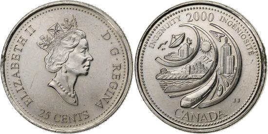 | | Canada, Elizabeth II, 25 Cents, 2000, Royal Canadian Mint, Nickel, | | | Crowned head right, denomination below, Crescent-shaped city views, date above | | FEATURES |