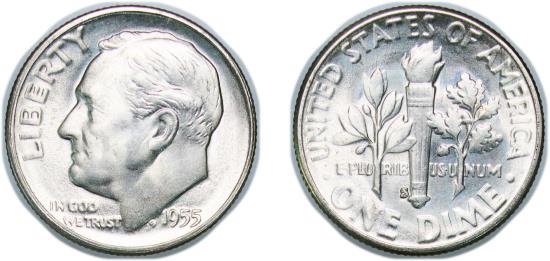 United States Federal republic 1955 S 1 Dime "Roosevelt Silver Dime" Silver (.900) San Francisco Mint (18500000) 2.54g UNC KM 195 Schön 197